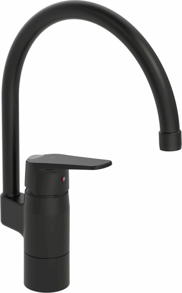 Kjøkkenbatteri i sort matt, med høy svingbar tut og strålesamler. Økoknapp som kan begrense vannmengden.