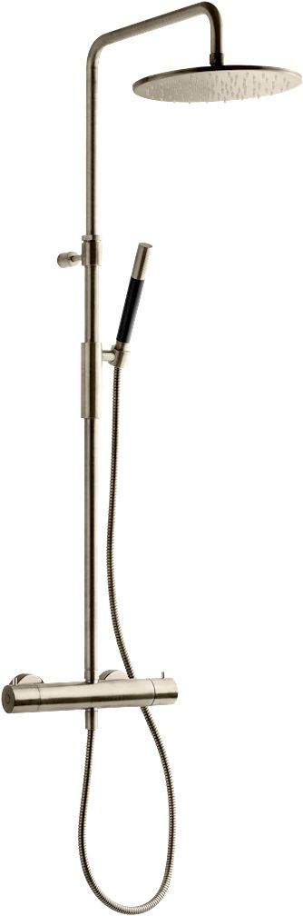 Komplett takdusj med trykk- og termostatstyrt dusjbatteri. Hånddusj med glider.
